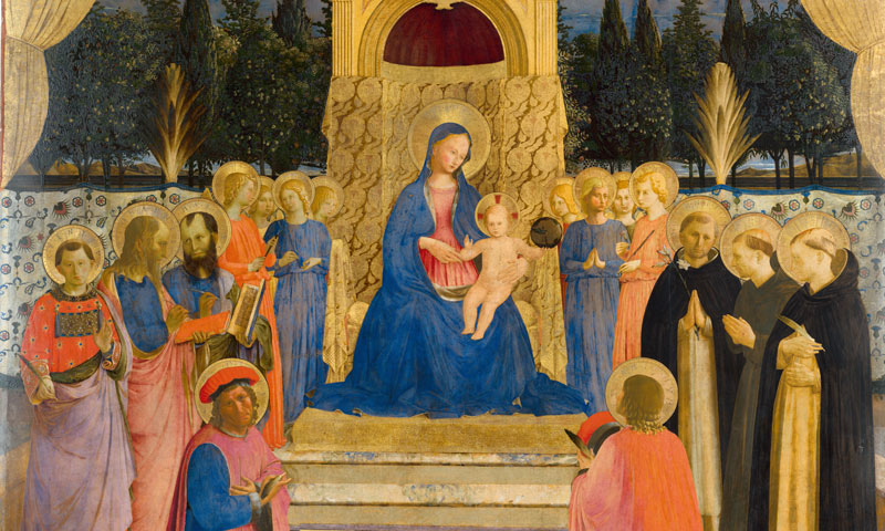 La scena è ambientata in un hortus conclusus, forse allusivo all’orto conventuale, che si apre verso un paesaggio collinare. La Vergine col Bambino siede su un trono incorniciato da un’architettura michelozziana, circondata da otto angeli e otto santi disposti secondo due direttrici prospettiche convergenti. La scelta dei santi riflette la committenza: san Domenico e san Marco richiamano l’ordine e l’intitolazione della chiesa, Cosma e Damiano alludono ai Medici, mentre la presenza di Lorenzo, Giovanni, Francesco e Pietro richiama nomi ricorrenti nella famiglia. Particolare rilievo assume Damiano, raffigurato quasi di spalle, memoria del gemello perduto di Cosimo e del fratello Lorenzo, morto nel 1440. In primo piano compare un tabernacolo ligneo dorato con Crocifisso e dolenti, definito “pannello eucaristico”, che instaura un dialogo diretto con il celebrante. L’opera era completata da una predella con storie dei santi Cosma e Damiano e da figure di santi dipinte sui pilastri laterali. Il complesso, una cosiddetta “pala quadra” di modello brunelleschiano, fu smembrato nel 1678-1679 e le singole parti disperse: è qui eccezionalmente ricomposta con 17 delle 18 parti oggi note. Le più recenti indagini diagnostiche hanno permesso di ricostruirne la struttura e chiarirne le dimensioni originarie.