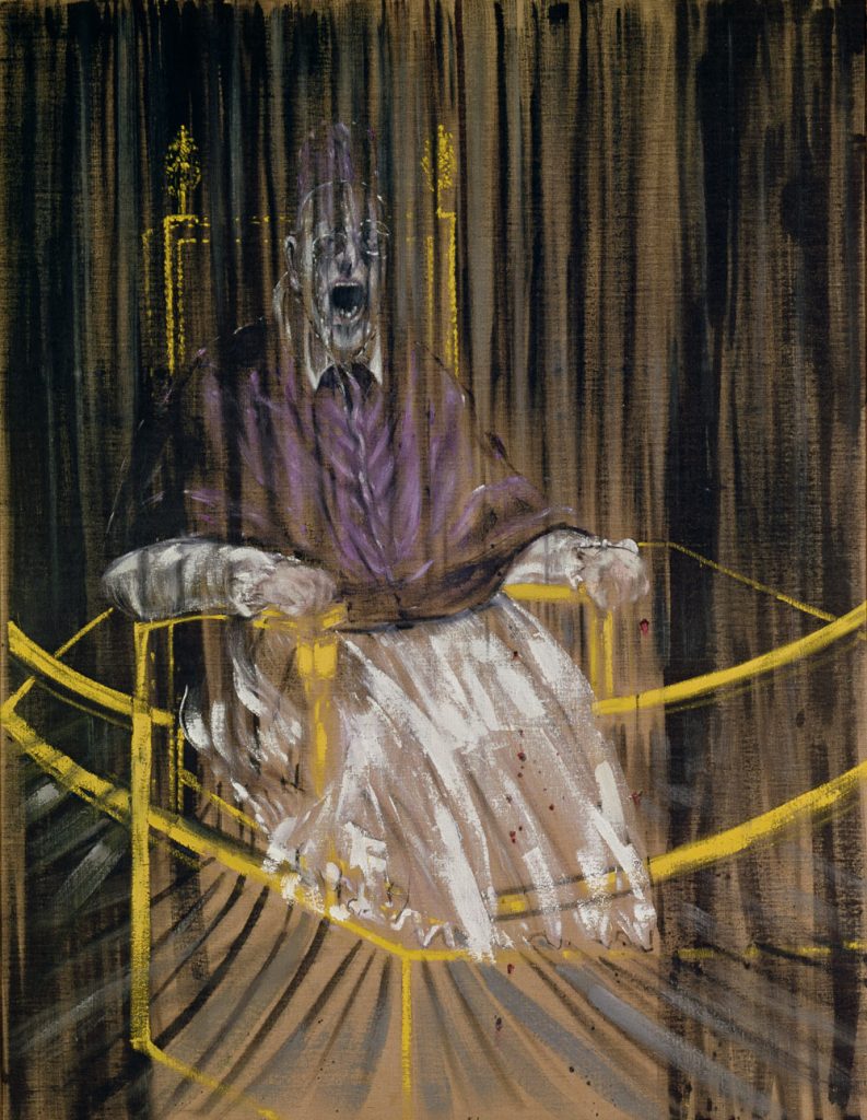 Yan Pei-Ming has taken his inspiration from the Velázquez portrait, veering away the Spanish artist’s dominant shades of red towards a blue marked by very dark streaks. He has maintained the Pope’s intense gaze but has transformed his hands: the left hand no longer rests listlessly on the arm of the chair but sports a closed fist in a gesture of power and determination, while the right hand no longer clutches a paper with the names of the painter and his sitter on it but is transformed into a claw. Yan Pei-Ming recalls how this 17th century portrait also inspired Francis Bacon: “I was fascinated when I discovered the portraits of Innocent X. The colour is fantastic. I was very inspired and I wanted, like Bacon, to work d’après Velázquez.”