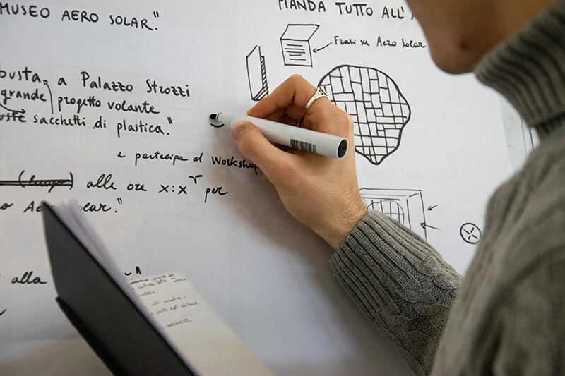 Working with Tomás Saraceno offered us a major opportunity because his studio comprises so many different professional figures: architects, video makers, designers and layout planners who teamwork with the artist and help to breathe life into his vision. Amid the variety of the projects produced by Saraceno and the Aerocene Foundation set up in 2015, we identified experiences that would allow us to experiment with interesting educational formats we could propose to communication and design students to tie in with the Palazzo Strozzi exhibition.