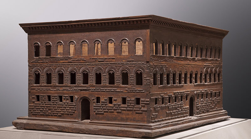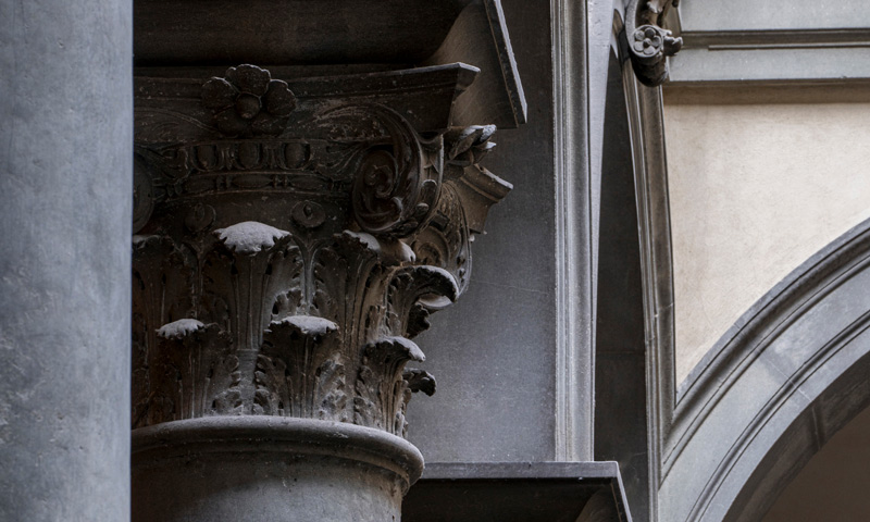 The palazzo is characterised by its regular, symmetrical ground plan, its graduated rustication, the large mullioned windows and the colonnaded courtyard, which reinterprets and innovates earlier models, in particular that of the Palazzo Medici. Despite Filippo the Elder’s wishes as set out in his will, at the time of his death the south façade and half of the crowning cornice were still unfinished, reflecting the political difficulties encountered by the family in the Medicean age.