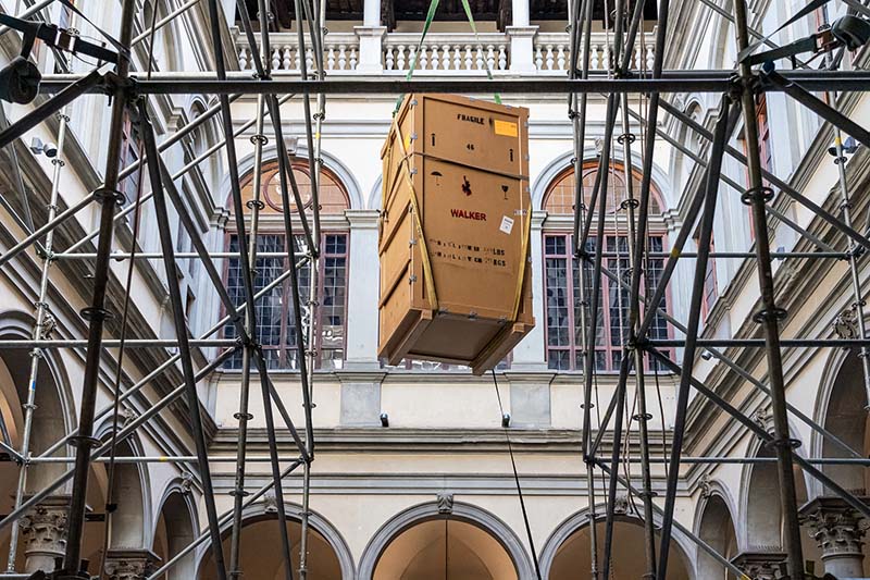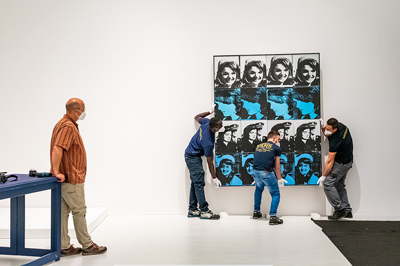 Sono oltre 80 le opere che sono arrivate a Firenze direttamente dagli Stati Uniti, in prestito dal Walker Art Center di Minneapolis. L’arrivo delle casse nel cortile è stato, per Palazzo Strozzi e per la città, un simbolo di rinascita: l’arte diventa nuovamente fruibile in presenza e non più solo a distanza. Il trasporto e l’installazione di così tante opere, in un’epoca così difficile, sono stati resi possibili dal lavoro degli staff di Palazzo Strozzi e del Walker Art Center che si sono ritrovati ad affrontare nuove sfide logistiche, per realizzare secondo i protocolli di sicurezza aggiuntivi tutte le operazioni necessarie all’apertura della mostra.