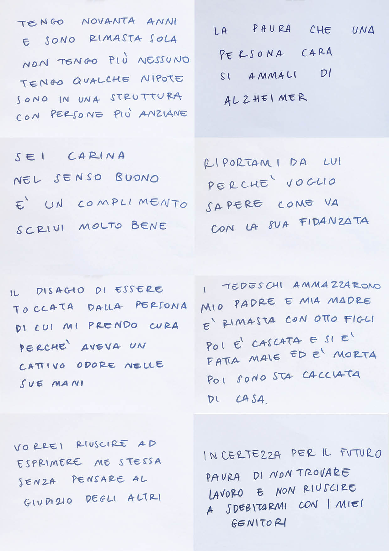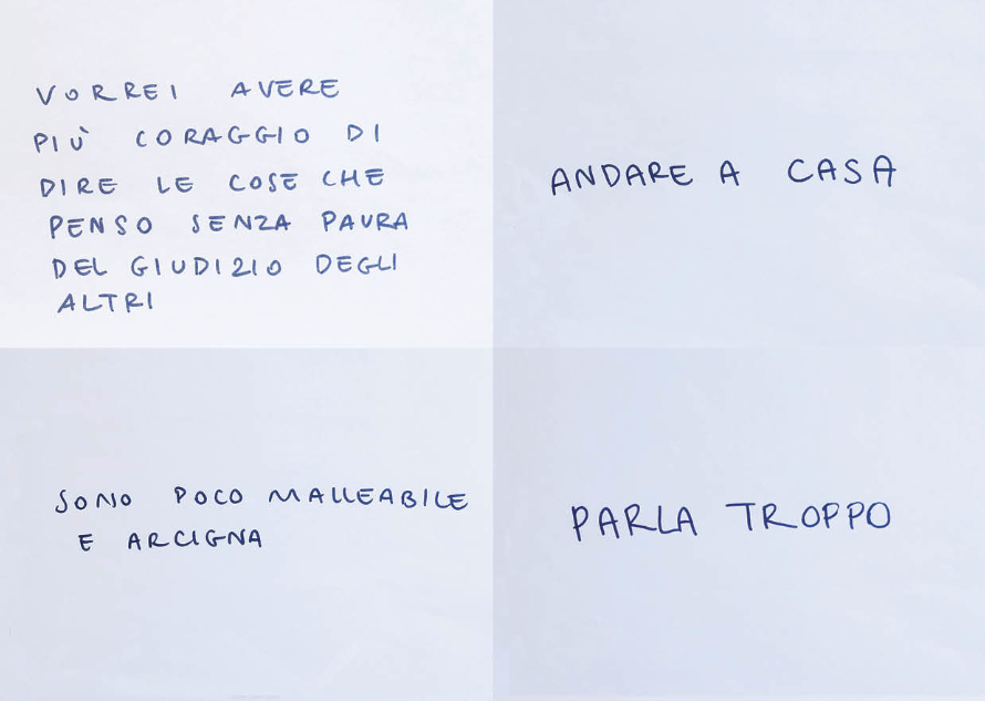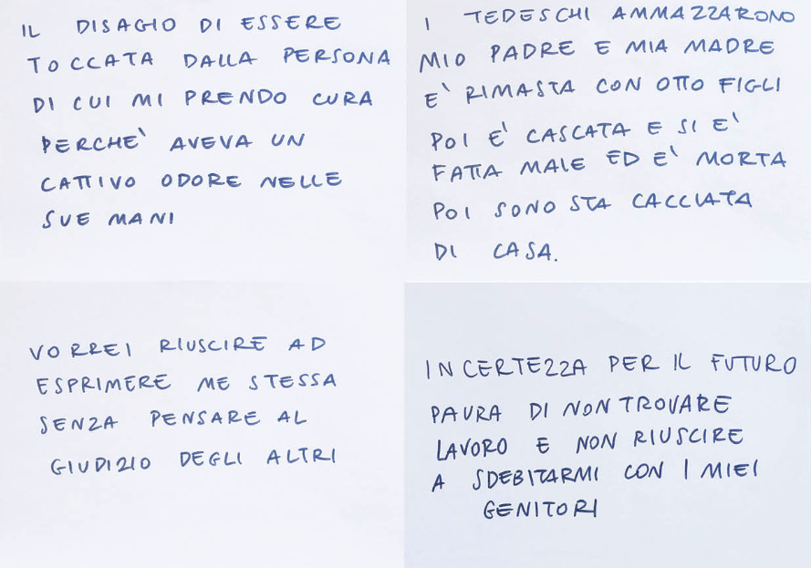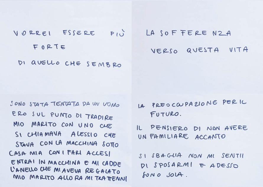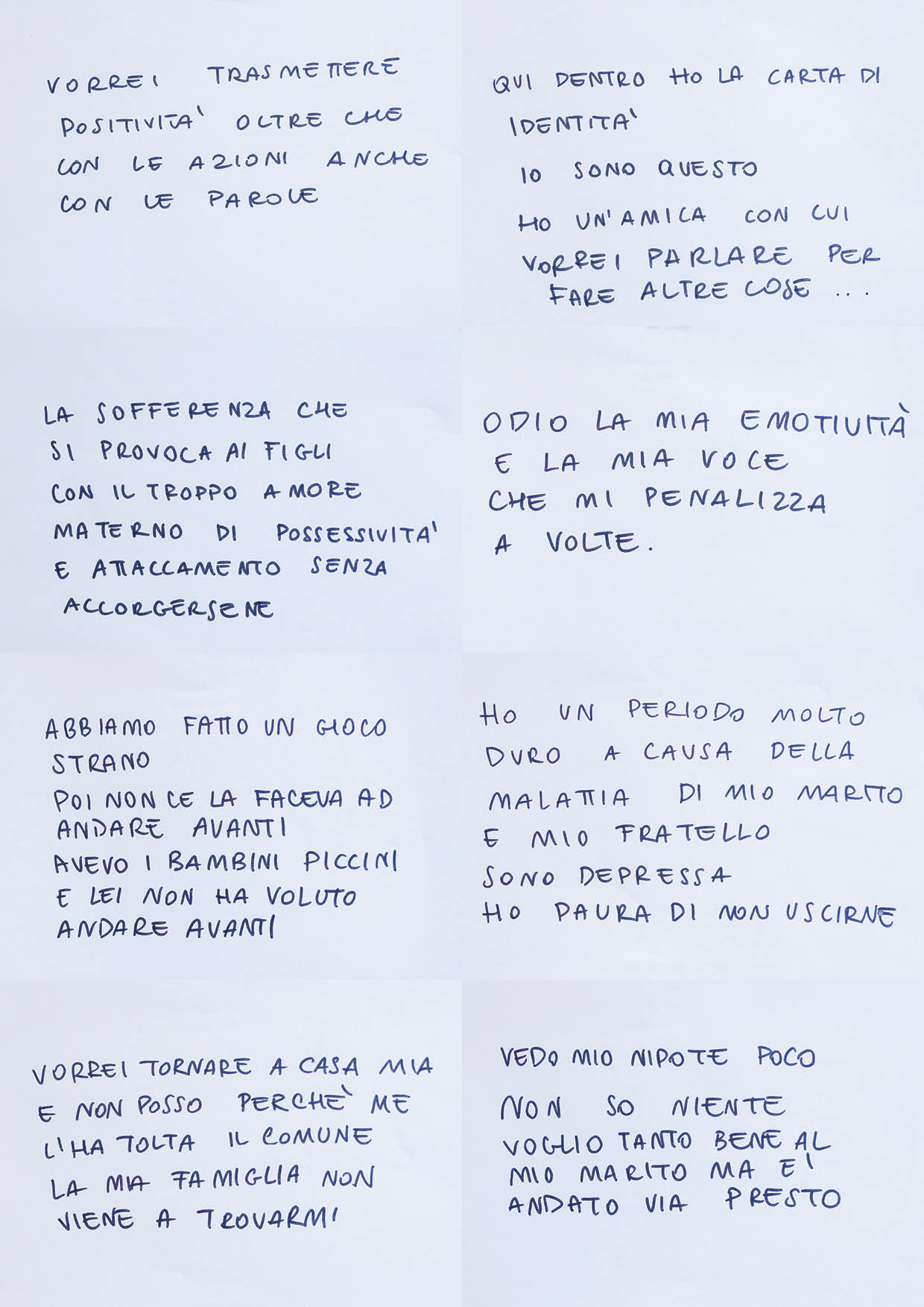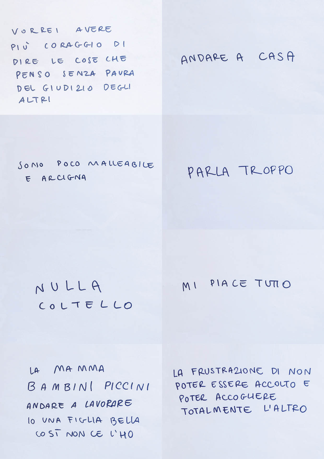 Ponendosi in una posizione di ascolto e definendosi come “un’esecutrice tecnica”, Virginia ha poi riletto ogni risposta singolarmente a ciascun partecipante, lasciandogli la scelta di cancellarla oppure salvarla e renderla pubblica (in forma anonima). Significativamente, tutti hanno scelto di mostrarla, esponendo pensieri e parole che rimangono quotidianamente nascosti, sepolti dentro, stavolta finalmente liberati.
