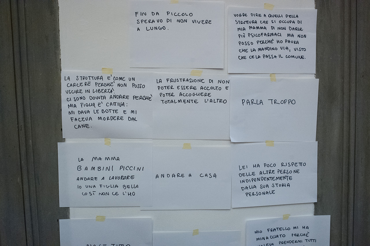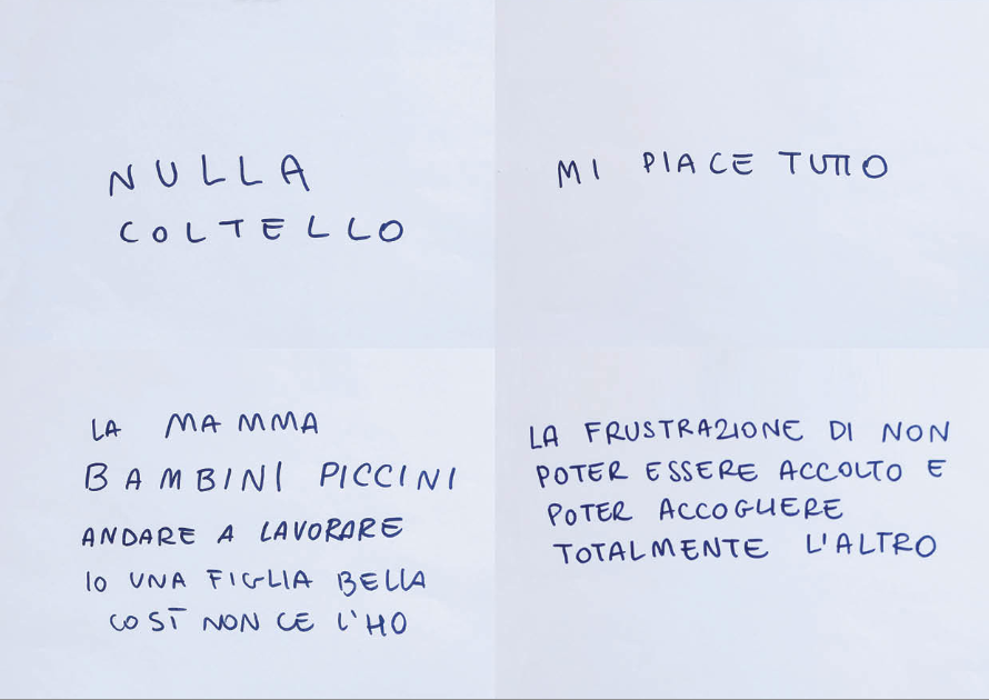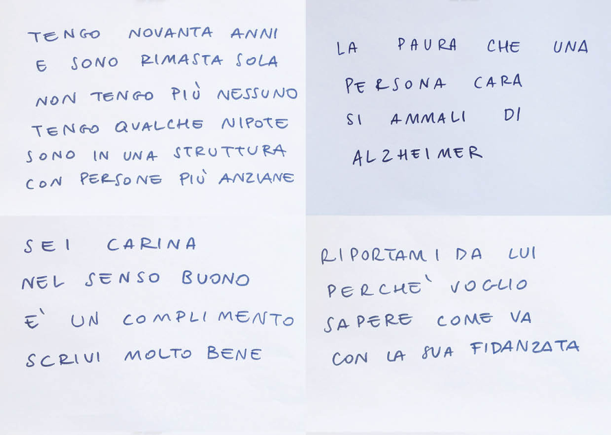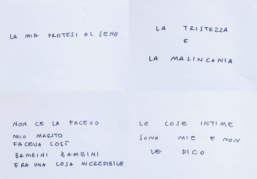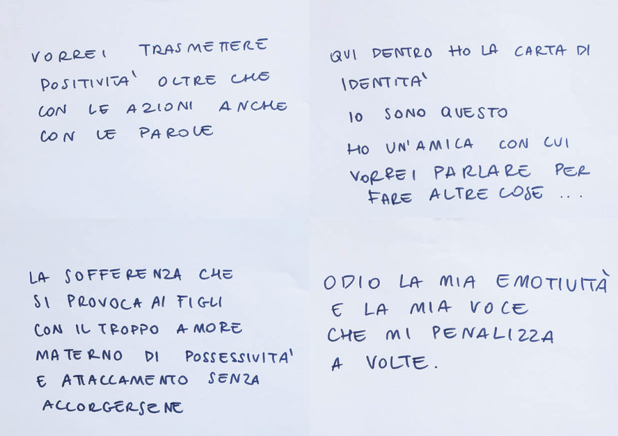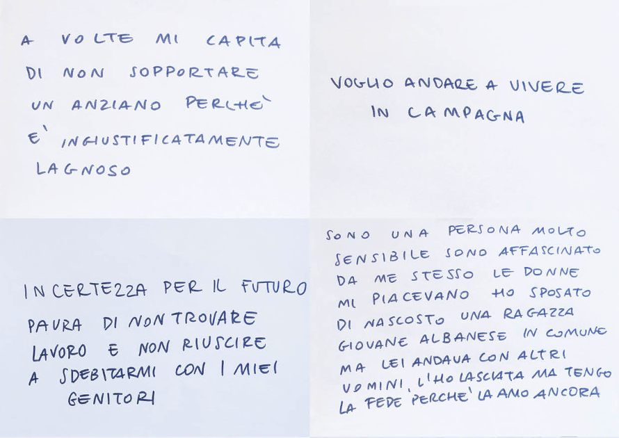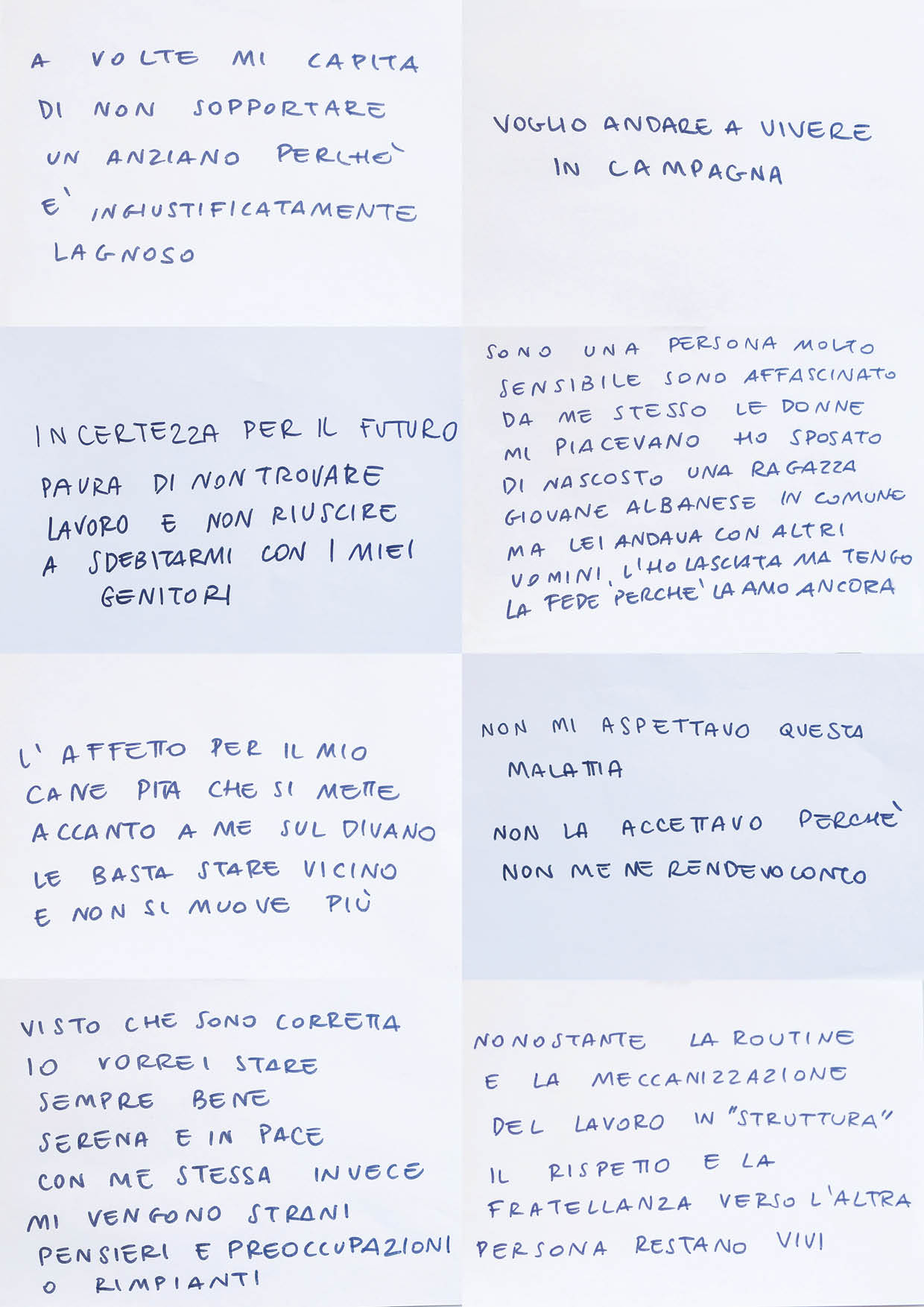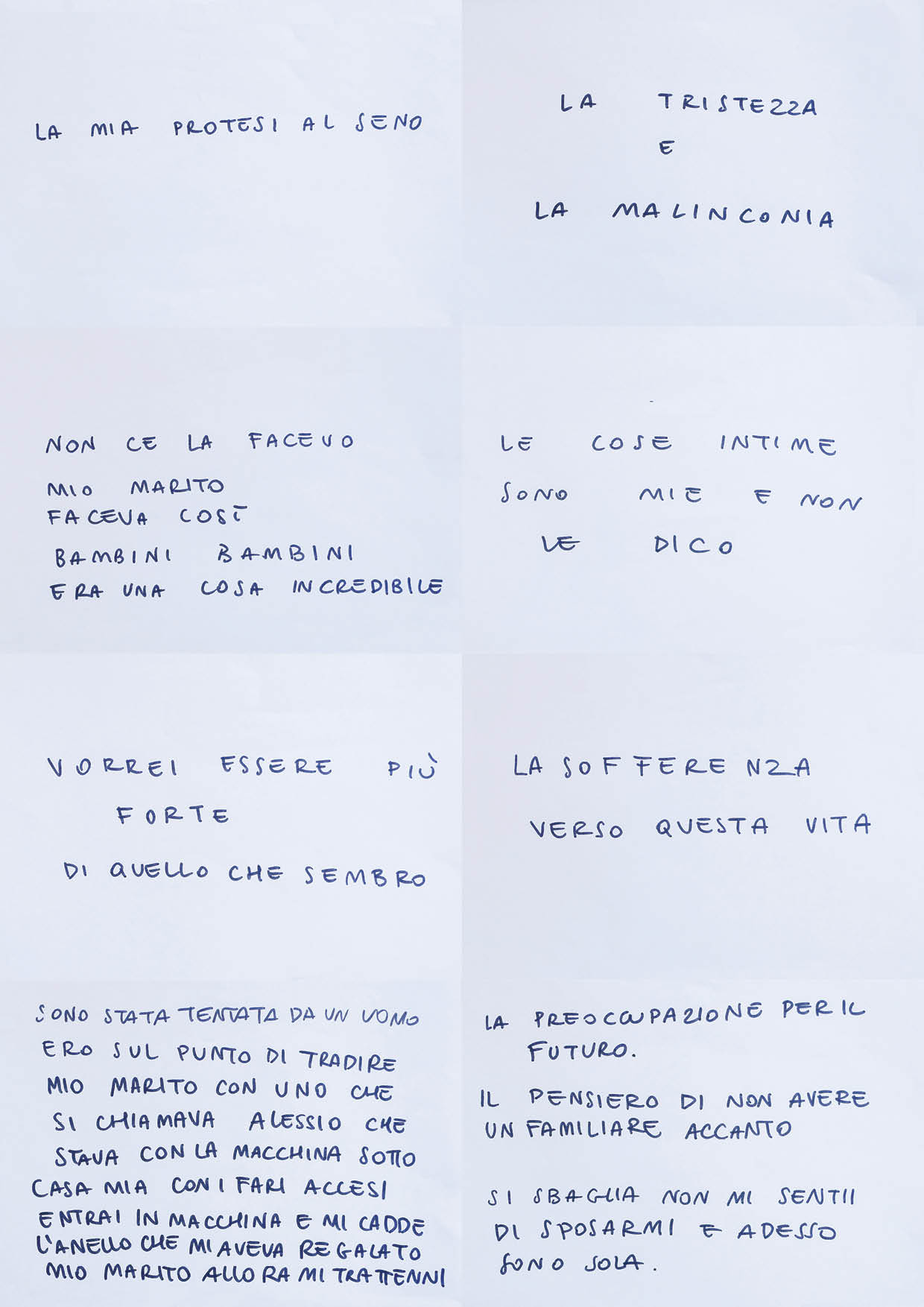 Ponendosi in una posizione di ascolto e definendosi come “un’esecutrice tecnica”, Virginia ha poi riletto ogni risposta singolarmente a ciascun partecipante, lasciandogli la scelta di cancellarla oppure salvarla e renderla pubblica (in forma anonima). Significativamente, tutti hanno scelto di mostrarla, esponendo pensieri e parole che rimangono quotidianamente nascosti, sepolti dentro, stavolta finalmente liberati.