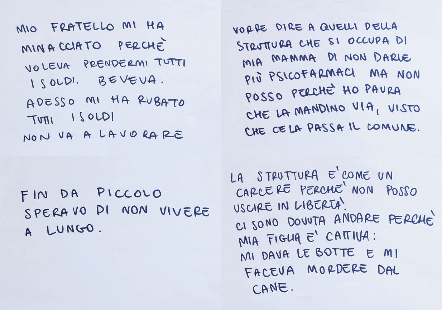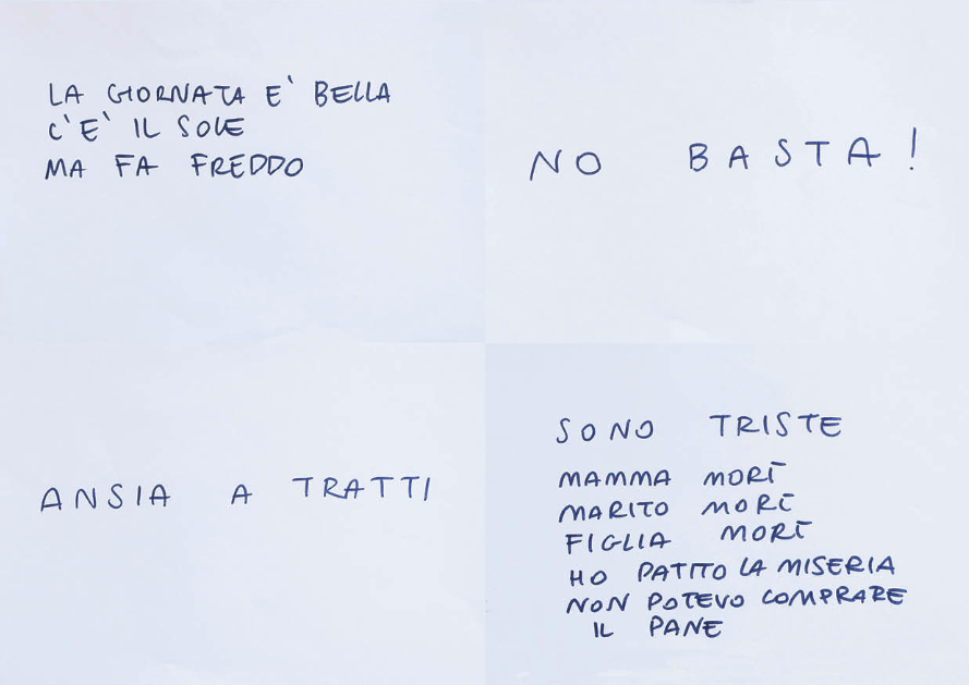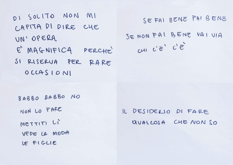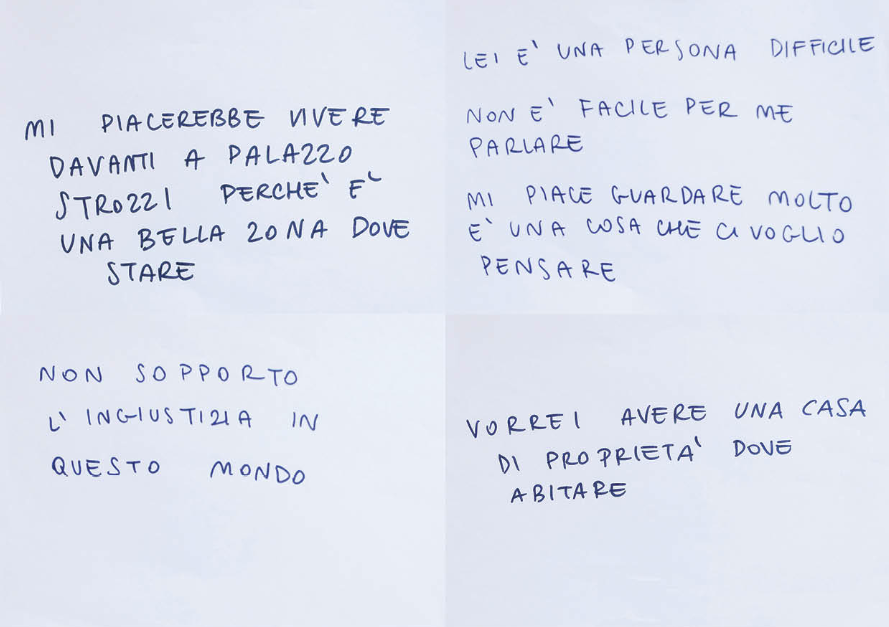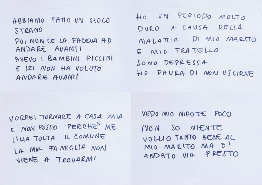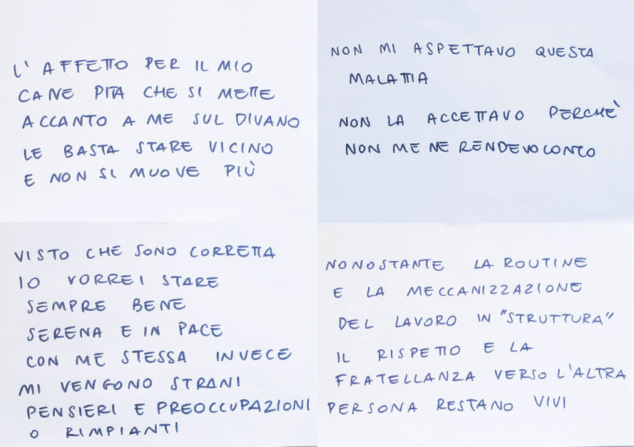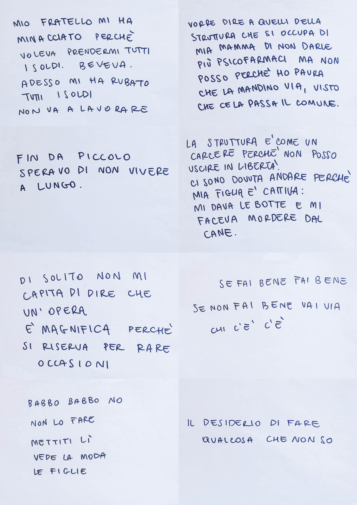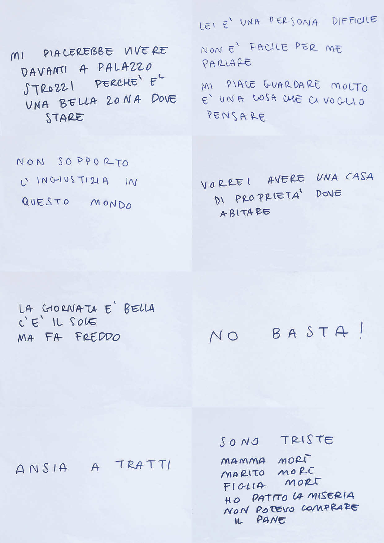 Ponendosi in una posizione di ascolto e definendosi come “un’esecutrice tecnica”, Virginia ha poi riletto ogni risposta singolarmente a ciascun partecipante, lasciandogli la scelta di cancellarla oppure salvarla e renderla pubblica (in forma anonima). Significativamente, tutti hanno scelto di mostrarla, esponendo pensieri e parole che rimangono quotidianamente nascosti, sepolti dentro, stavolta finalmente liberati.