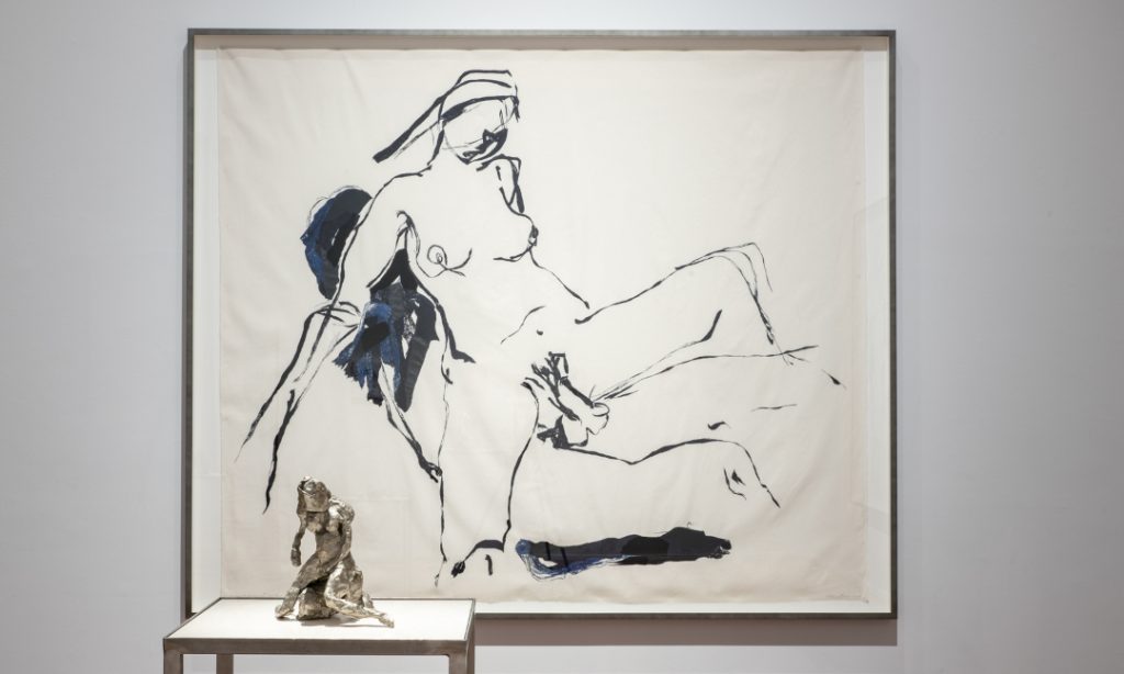 Nessuna delle sessanta opere esposte, nessuno degli scabrosi nudi femminili – pennellate brutali e colature –; nessuna delle sculture di corpi appena abbozzati, prostrati e mutilati, piccole o monumentali, ma sempre antieroiche e intensamente erotiche, con le impronte delle mani dell’artista impresse nel bronzo; nessuna delle poesie d’amore disperate scritte col neon (eccone una: You put your hand / Across my mouth / But still the noise / Continues / Every part of my body / is Screaming / Smashed into a thousand / Million Pieces / Each Part / For Ever / Belonging to you); nessuno dei suoi arazzi (uno dei quali esordisce: I do not expect to be a mother / But I do expect to die alone); niente di niente – nemmeno la sala che richiama contenuti cristologici, e il tema ricorrente della crocifissione – dà la benché minima pallida idea di un’anima disincarnata che cerca «contatto con l’anima dell’altro in modo da poter generare un’altra anima», né di una mente o di un cuore che possano pensare o sentire separati dal corpo. Soprattutto non la danno le opere sessualmente esplicite, bellissime, dall’impatto pornografico: il video di una donna a gambe larghe e tacchi alti, ad esempio, la vulva bene in vista, che si masturba, associato alla scritta al neon giallo Those who suffer LOVE; oppure il grande calicò ricamato intitolato I don’t need to see you I can feel you, dove una donna sta seduta sopra un uomo che la penetra da dietro, senza che i due possano guardarsi; o ancora l’acrilico con la scritta bianca su fondo nero I wanted you to fuck me so much I couldn’t paint any more.