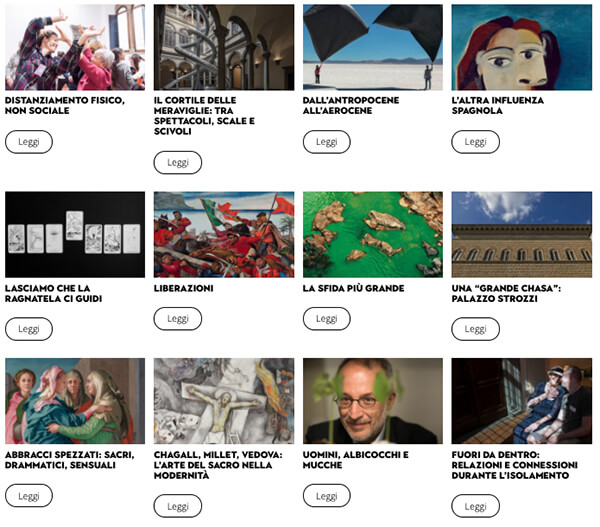 Anche altri numeri possono aiutare a raccontare questo progetto. Sulla piattaforma IN CONTATTO abbiamo pubblicato ventiquattro contributi, letti da quasi 60.000 utenti unici. Sui canali social, tra Facebook e Instagram, abbiamo pubblicato oltre 100 post, raggiungendo oltre un milione e mezzo di persone e facendo crescere la nostra community online del 10% in solo due mesi. L’elevato tempo medio trascorso sulle pagine di IN CONTATTO rappresenta inoltre un dato estremamente interessante, dimostrando che le persone hanno preferito focalizzare la loro attenzione in una fruizione non superficiale, nonostante il momento di frenesia nel consumo dei contenuti online. La “top 5” degli articoli più letti è rappresentata da Siamo tutti sulla stessa barca, Abbracci spezzati, A tavola con Pontormo, Uomini, albicocchi e mucche, Il cielo in una stanza. Non si tratta di una semplice classifica, ma di un vero e proprio specchio della poliedricità del nostro approccio e della varietà di interessi dei nostri lettori. Una menzione speciale la merita il progetto educativo a distanza L’ARTE A CASA dedicato alle famiglie con bambini e ragazzi, che è stato visitato da quasi 6.000 utenti, molti dei quali ci hanno inviato anche i risultati delle varie attività. Inoltre abbiamo apprezzato l’affetto e la stima di chi, da tempo, segue le nostre iniziative: la newsletter è stato infatti lo strumento principale attraverso il quale IN CONTATTO è stato fruito, a dimostrazione della vicinanza del nostro pubblico anche in un momento di distanziamento fisico.