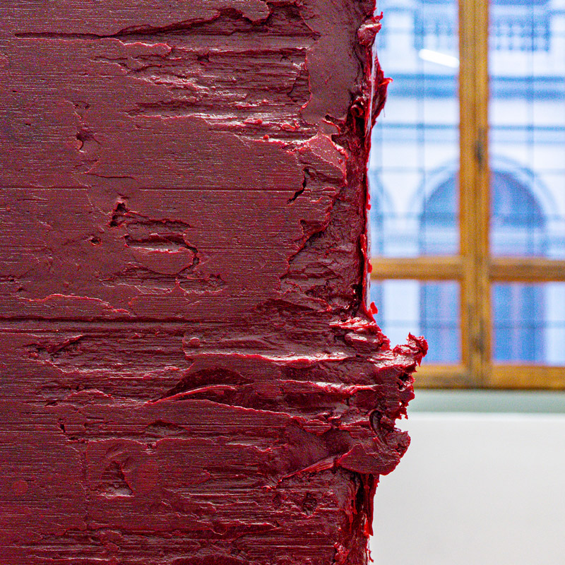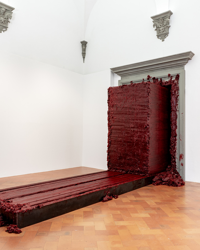 La grande massa di cera color sangue si muove tra le porte del palazzo. Svayambhu (2007), “sorto da sé”, avanza lento, senza preoccuparsi della propria mole: come mosso da una volontà di vita cieca alle circostanze – alla nostra presenza, a quelle porte in cui non è detto riesca a infilarsi – e in questo spingersi prende forma, scorticato dall’attrito con pareti, pavimento e stipiti, lasciando dietro di sé una scia amorfa di macchie. Plasmato non da mano umana, ma dall’accidente: scultura senza autore, senz’altra volontà se non la propria. È un oggetto che simula di essere soggetto; un corpo che si muove, che sporca e lascia tracce, nasce e muore. Il suo scopo non è la verità ma l’artificio, l’illusione dell’inanimato che prende vita: untrue, unreal.